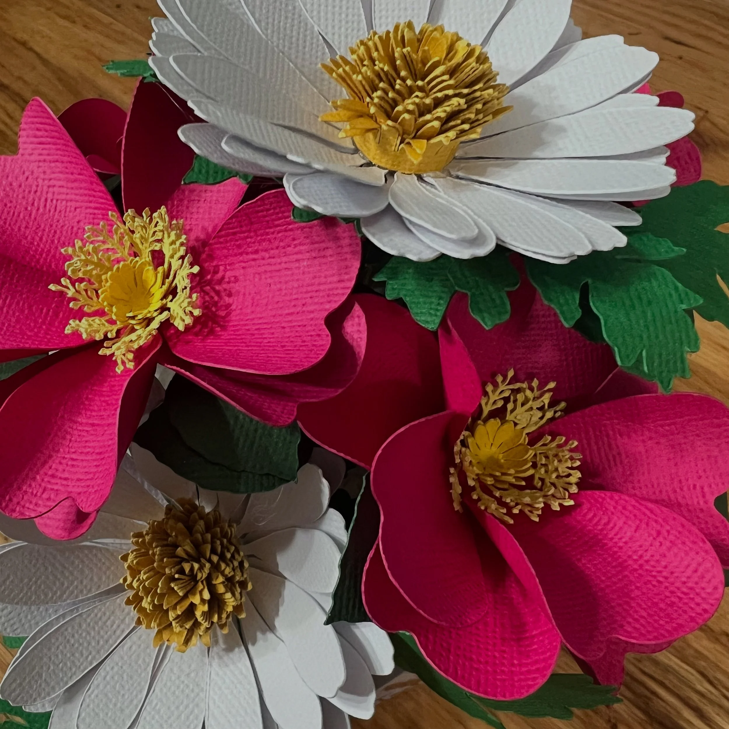 Artificial flower arrangement with pink, white, and yellow flowers and green leaves on a wooden surface