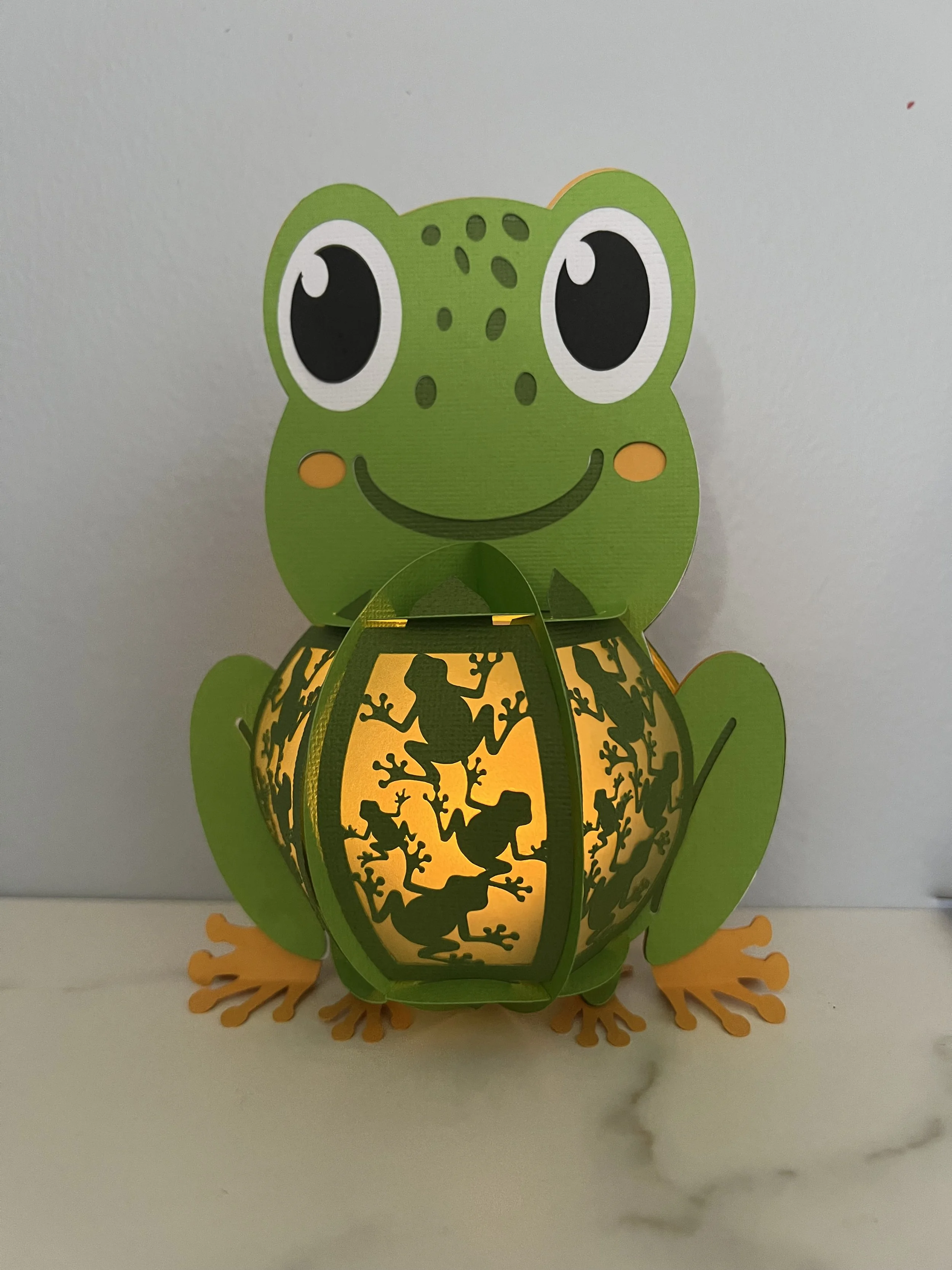 A decorative paper lantern in the shape of a smiling frog with a lantern belly featuring lizard silhouettes.