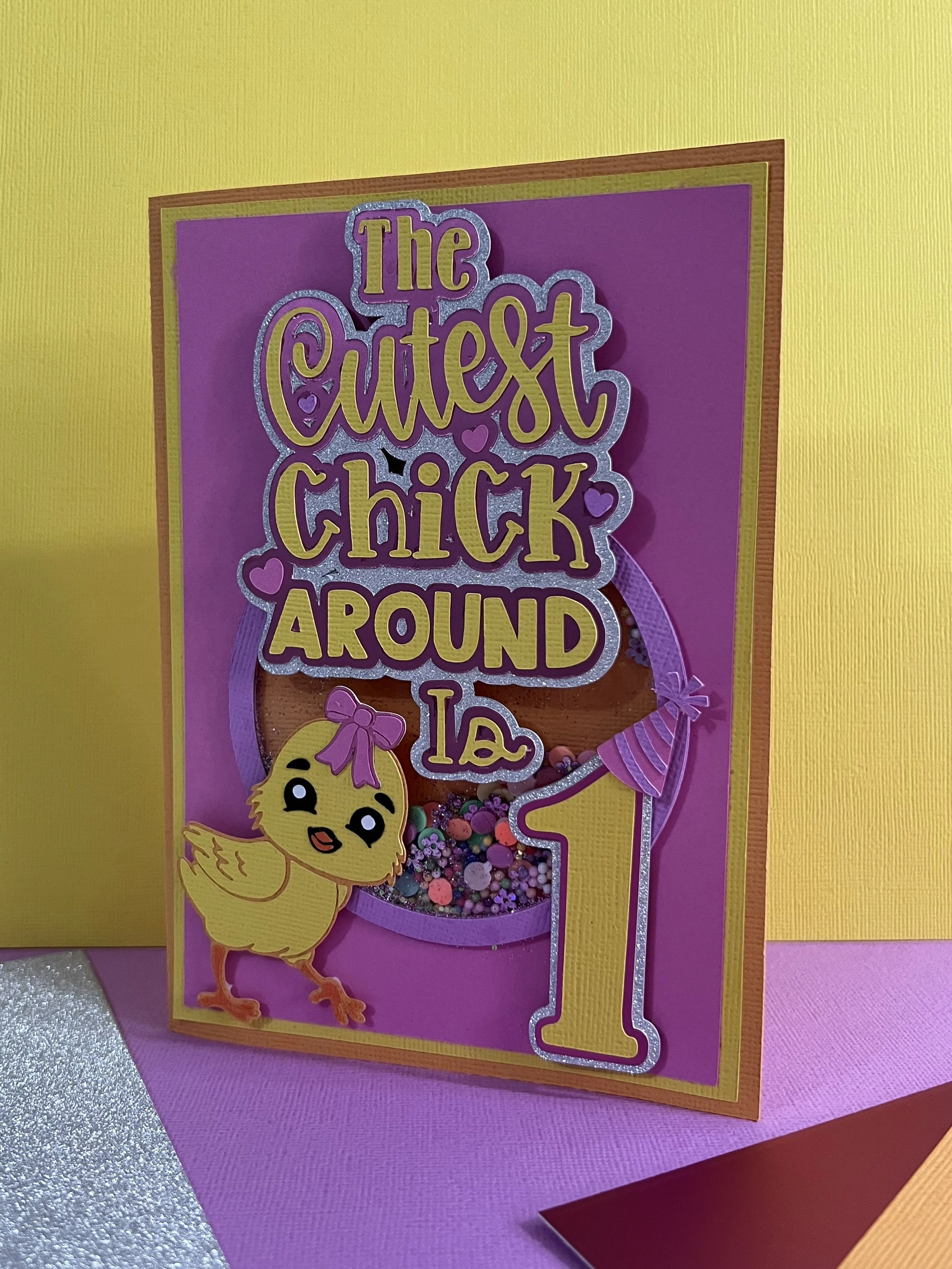 A colorful birthday card with a yellow chick illustration, glittery text saying 'The Cutest Chick Around' and the number 1, decorated with purple, pink, and yellow accents, placed on a pink surface with a yellow background.