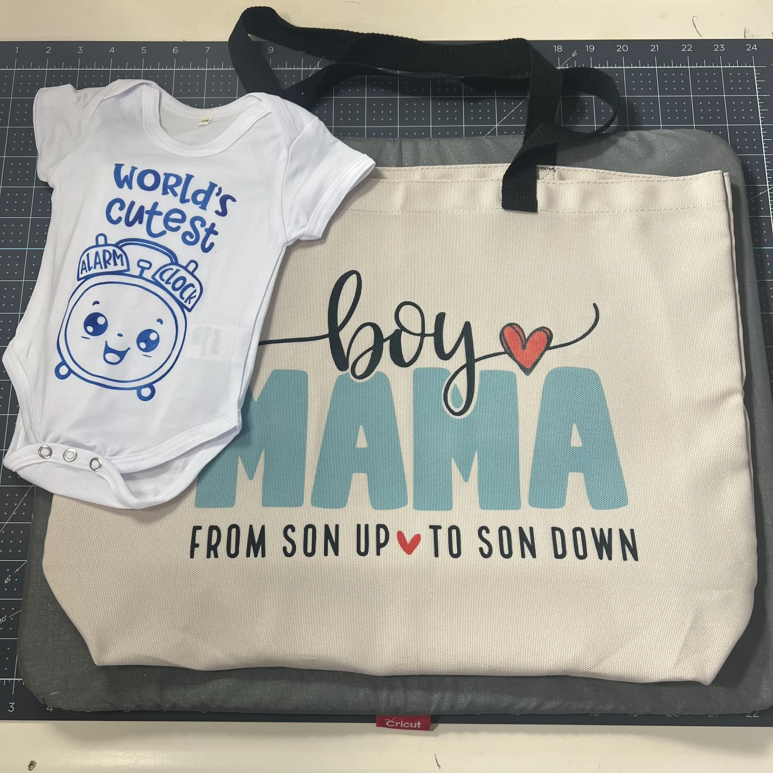 A white baby onesie with a blue cartoon alarm clock face and the text "World's cutest" hangs on a black and gray carrying bag with a graphic that says "boy MAMA from son up to son down."